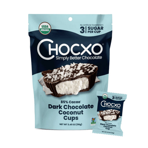 Chocxo3g Sugar, 85% Cacao, 100% Organic Meet Dark Chocolate Coconut Cups, the newest addition to the Chocxo portfolio and a delightful combo of organic c...