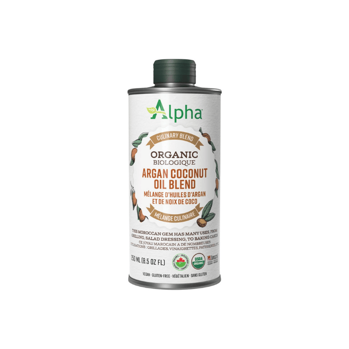 Alpha Organic Argan Coconut Oil Blend is a vegan-friendly culinary oil with a smooth, toasted, nutty flavour and high oleic acid content. It is lighter than pure coconut oil, making it a great choice for dipping bread, drizzling on pasta or couscous, grilling, and baking.
