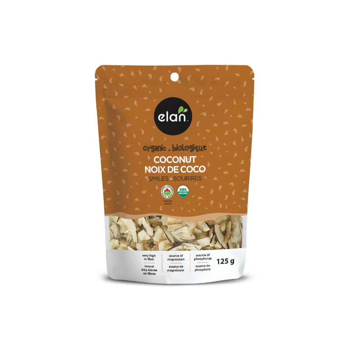 Elan Organic Coconut Smiles, are crunchy, lightly toasted and highly addictive. They are unsweetened to let their subtle natural, nutty flavor shine.  They're great in your baking recipes or as a topping for cereal, yogurt and smoothies. Bring them with you and eat them right from your backpack or hand bag as a nutritious on-the-go snack.