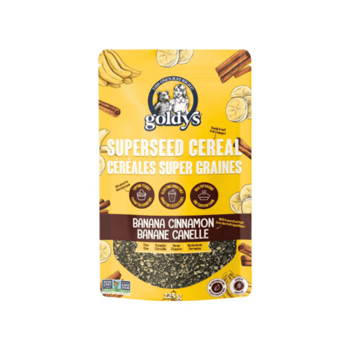 Goldy's superseed cereal is a smooth, silky and crunchy way to start your day. Packed full of essential nutrients and antioxidants, this chia seed cereal is perfect no matter what your day brings. With real banana pieces, sweet yet spicy cinnamon, and superfoods like pumpkin seeds and hemp seeds, this blend really has it all–high protein, high fibre yet low sodium and low sugar. It's like banana bread in a bowl, the perfect way to start each day!