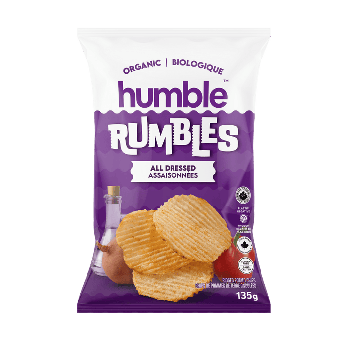 A Canadian Classic, the Humble Rumbles version! Sweet, salty, tangy, and a little smoky. All Dressed is the ultimate flavour explosion. Our organic, ridged potato chips are coated in a bold blend of seasonings that bring together the best of barbecue, salt & vinegar, and a hint of sweetness. Every crunchy bite is packed with big, mouthwatering flavour, making it impossible to eat just one. It’s the perfect chip for those who love a little bit of everything.