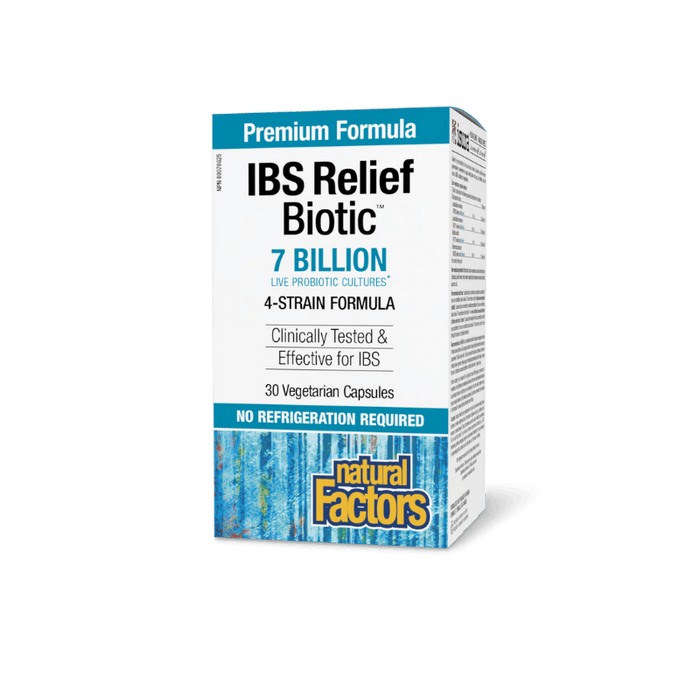 Natural Factors Relief Biotic® is a multi-strain formula featuring 7 billion colony forming units (cfu) of probiotics, including Lactobacillus, Bacillus, and Enterococcus strains shown to relieve some symptoms of irritable bowel syndrome (IBS). This innovative probiotic formula also helps reduce the risk of antibiotic-associated diarrhea and is shelf stable – no refrigeration required!