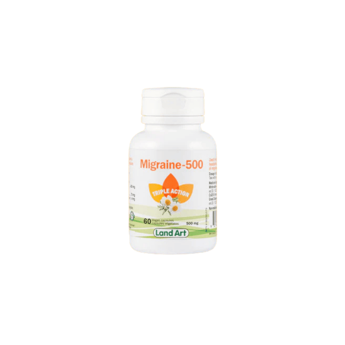 Land Art’s Migraine 500 combines feverfew, CoQ10 from fermentation, and white willow bark to help prevent migraines and ease symptoms like nausea and vomiting. Feverfew, recognized by WHO and ESCOP, helps relieve headaches; CoQ10 reduces migraine frequency and associated symptoms; and white willow bark, containing 15% salicin, offers longer-lasting relief than aspirin. The supplement can be taken daily (2 capsules) as a preventive or as needed at the onset of a headache.