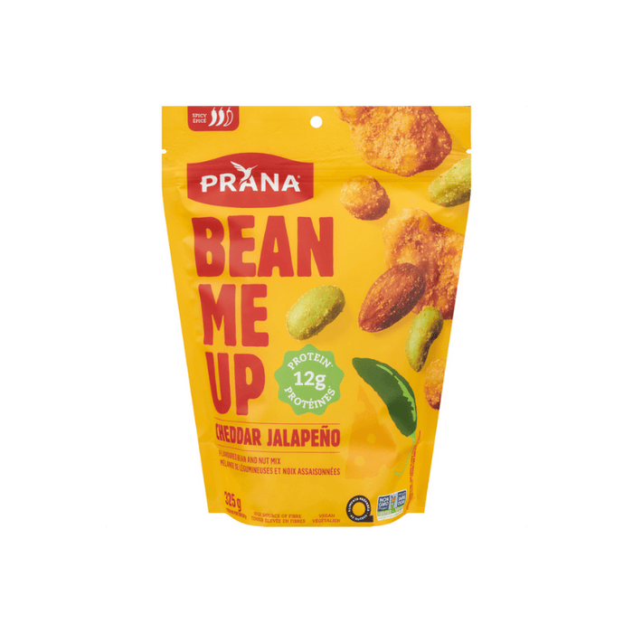 Prana's Bean Me Up Cheddar Jalapeno is a blend of seasoned legumes and nuts that combines crunch with spicy taste. Edamame, beans, peas and almonds come together for a snack rich in protein and fiber.