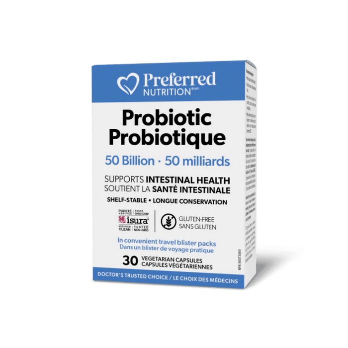 Preferred Nutrition Probiotic 50 Billion is a high-potency 10-strain formula that helps relieve abdominal discomfort, such as bloating and constipation. It combines shelf-stable Lacticaseibacillus, Lactiplantibacillus, and Bifidobacterium strains to help support gastrointestinal health and is suitable for individuals aged 6 years and older. Each shelf-stable vegetarian capsule is guaranteed to contain 50 billion active cells at expiry.