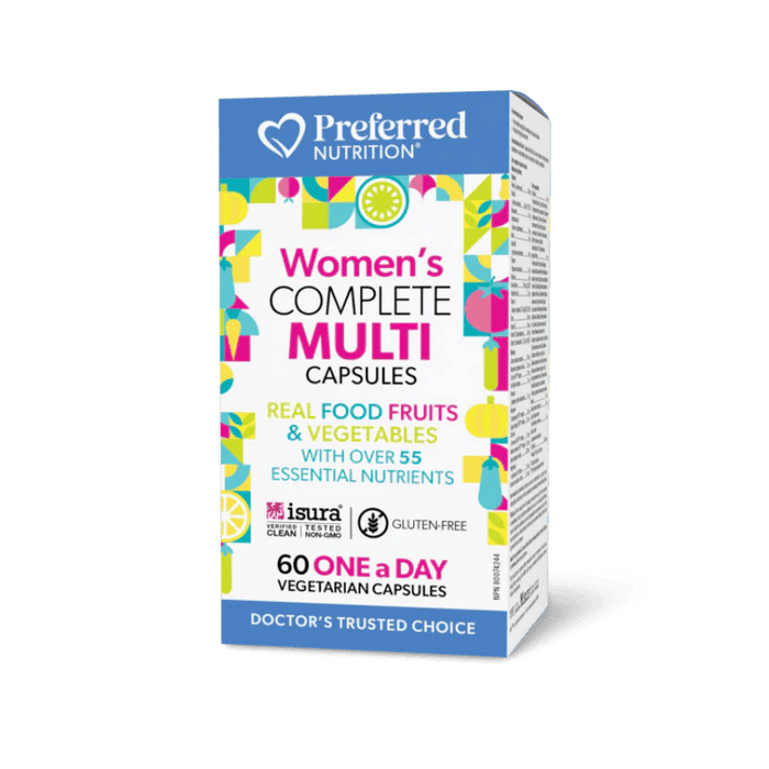 Preferred Nutrition Women’s Complete Multi is a one-per-day comprehensive blend of vitamins, minerals, and supportive nutrients, including B vitamins, bioavailable vitamins D3 and K2, folic acid, and chelated minerals, along with nutrition from real-food fruits and vegetables. Formulated specifically for women, this formula helps in energy metabolism, and helps maintain immune function and build strong bones and teeth. It is non-GMO and suitable for vegetarians.