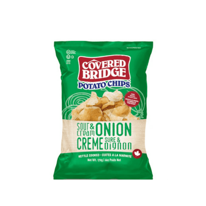 Covered Bridge Sour Cream & Onion kettle cooked potato chips are a great addition to our line of products. We use our very own homegrown dark Russet potatoes to make a potato chip that is robust with flavour.